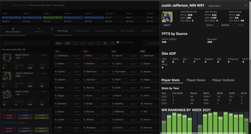 With four running backs (Jonathan Taylor, Christian McCaffrey, Austin Ekeler, Derrick Henry) and one receiver (Cooper Kupp) going off the board in the first five picks, I think Jefferson is a phenomenal way to start off our draft. The former LSU superstar has had the greatest start to a career for a wide receiver in NFL history, with back-to-back seasons of over 1,400 receiving yards. Add in the fact that Jefferson will be in a much more modern offense with Rams offensive coordinator Kevin O’Connell coming to town, and Jefferson should only see more volume and opportunities. There’s a real chance we just drafted the overall WR1 for this season, especially in a PPR format.