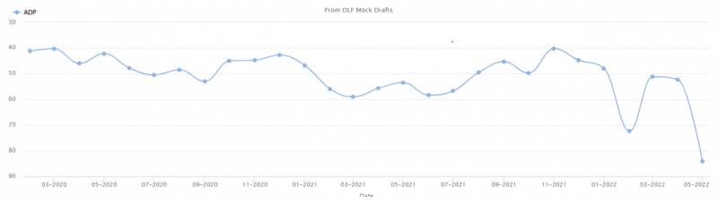 Recently turned 25, the injury prone back has been in a precipitous decline and is now found as DLF’s RB26, though he continues to slide. As seen on his historical ADP chart below, he has nearly returned to his rookie-year value.
