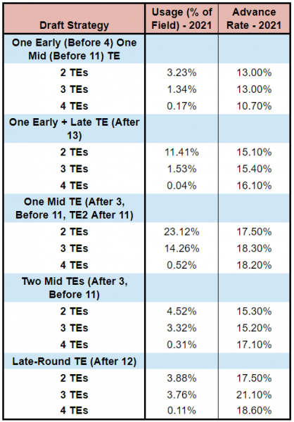 As you can see, selecting one mid-round TE paired with a later-round guy was by far the most popular strategy, as 23.12% of the field went that route and with decent results. Those teams advanced to the playoffs 17.50% of the time, which was the fifth-highest advance rate last year.