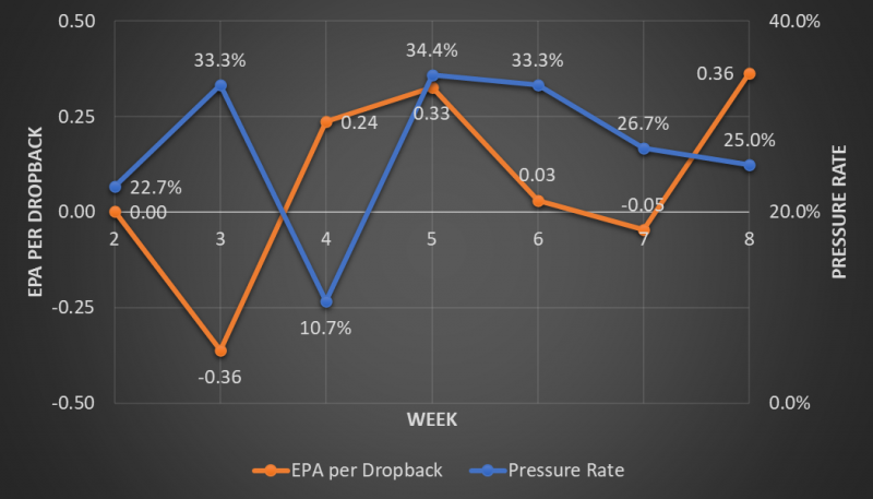 Of course, it’s a two-game sample. But let’s look at each of those games. Kansas City had a 32.3% pressure rate before facing San Francisco in Week 7. They blitzed on 31.0% of Garoppolo’s dropbacks but only got pressure on 26.7%. The Rams game was even more interesting.