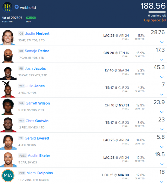 Only two other Millionaire winners this season have correlated their defense with another player from the same team. Four other winners from 2019–2020 used a WR/DEF mini-stack.