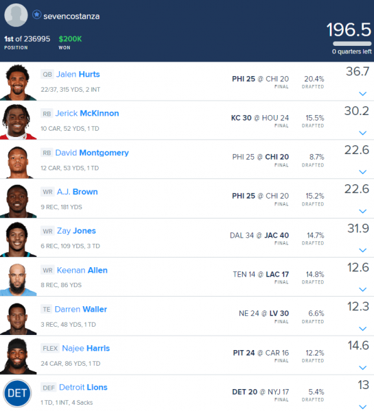 Miles Sanders was on over 25% of rosters so while the Eagles passing game was popular as well, stacking them with the opposing running back was a unique combination.