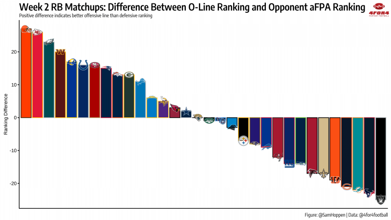 Below I’m going to be digging into specific weekly matchups between offensive lines and the opposing defense's aFPA —one of the many useful tools available to us here at 4for4. Many sites publish raw fantasy points allowed by position, but 4for4 goes a step further and adjusts those numbers for a defense’s relative year-to-date schedule strength. These numbers will continue to strengthen through more data points as the season progresses and, when compared to a team’s advantages within the trenches, will expose fantasy pieces we may not have otherwise considered.