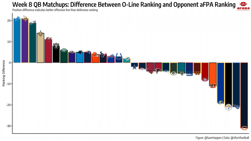 Below I’m going to be digging into specific weekly matchups between offensive lines and the opposing defense's aFPA —one of the many useful tools available to us here at 4for4. Many sites publish raw fantasy points allowed by position, but 4for4 goes a step further and adjusts those numbers for a defense’s relative year-to-date schedule strength. These numbers will continue to strengthen through more data points as the season progresses and when compared to a team’s advantages within the trenches will expose fantasy pieces we may not have otherwise considered.