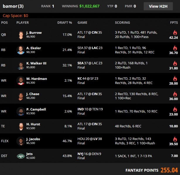 Cumulative ownership of the winning lineup was 189.2%, the highest for any winner dating back to Week 1 of 2019.