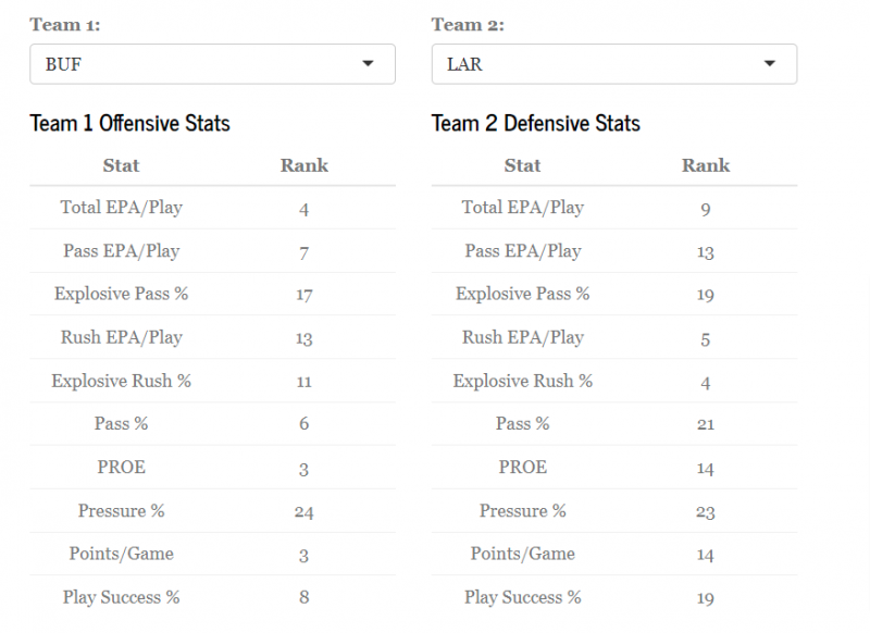 We created a one-stop shop for every metric that is valuable towards handicapping a team or making a bet. Beyond listing every team, we also included a section where you can pick two teams and match them up against one another (picture 2). Metrics include EPA, pressure rate, play action rate, explosive pass/run rate, pace, and so much more. Every stat can also be filtered by anything desirable.