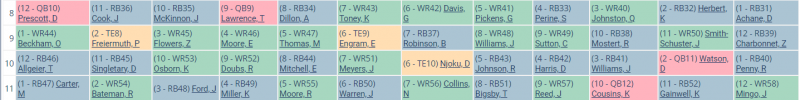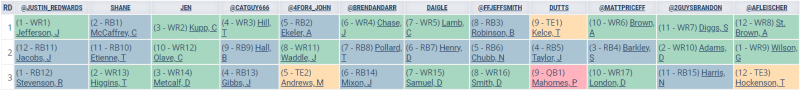 With no defenses or kickers in this particular mock draft, contestants are loading up on their bench, with a few QB2s sprinkled in. Russell Wilson, Anthony Richardson, Daniel Jones, and Tua Tagovailoa provided four of our teams with some insurance at their “onesie” position. As the football world waits for once-great fantasy producers to sign with a team, drafters took each of Dalvin Cook, Ezekiel Elliot, and Leonard Fournette in this range.