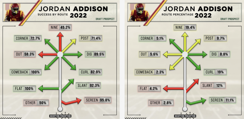 Addison’s size became a concern at the NFL Combine, as he came in at a slender 173 pounds at 5’11”, but he’s proven he can line up at multiple receiver positions and Matt Harmon’s Reception Perception maps out success at the NFL level for the rookie.