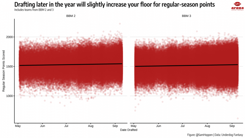 One of the biggest debates in best ball tournaments is determining when in the offseason you should draft your team. On one hand, drafting earlier in the offseason will give you the advantage of ADPs not fully settling in and being able to get closing line value on player ADPs. On the other hand, drafting later in the offseason will lead to fewer dead players (players who get injured or buried in the depth chart in the offseason) on your roster. Well, if you're aiming for one of the regular season prizes, drafting later seems to offer a slight edge.