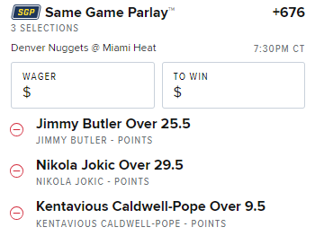 If we were to parlay the over on Nikola Jokic's points, the over on Jimmy Butler's points, and the over on Kentavious Caldwell-Pope's points, we would be given odds of +676: