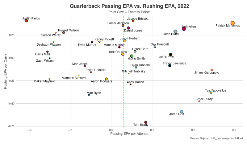 This is one of my favorite graphs from last season. Fields was the worst quarterback by EPA per passing attempt in 2022, but the best quarterback by EPA per rushing attempt and a great fantasy player as a result. In short, Fields has proven that he can succeed in fantasy despite his shortcomings as a quarterback.