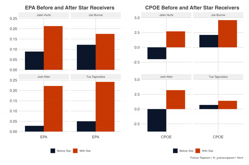 This graph backs up the idea that a true #1 receiver could truly unlock Fields as a passer in this offense, as all four QBs improved drastically in both EPA and completion percentage over expected after getting a star wideout. If Moore's presence helps Fields can tap into some of this upside and become more of a dual threat, he could be one of the most dangerous players in fantasy football.