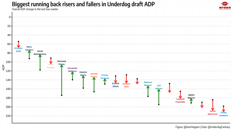 Right now, they are being drafted back to back as RB48 (Mostert) and RB49 (Wilson) in Underdog drafts and have the potential to outproduce their RB4 designations. Wilson rose two and a half rounds to 14.05, while Mosert also experienced a near two-round spike in ADP to 13.10.