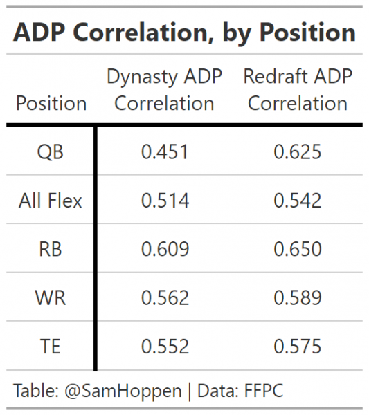 I'm going to start off with a birds-eye view of data and zoom in from there. Below is a table that outlines the correlation between each position's dynasty and redraft ADP rank with their final positional ranking. Flex, in this scenario, includes running backs, wide receivers, and tight ends.