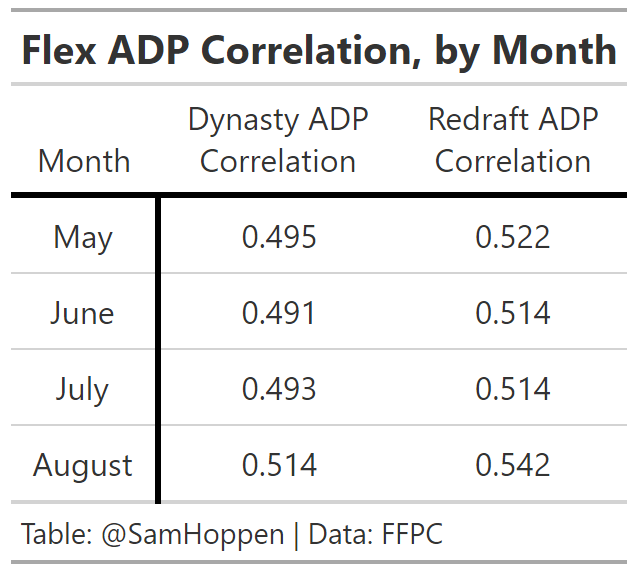 Next, I took a look at the same view, but for all flex positions combined. We see a much narrower gap between dynasty and redraft ADP here than with the quarterback position. Another trend that bears out is that we see the correlation rise as we move through the draft season. This is generally what we should expect with the data because, as the offseason rolls on, we get more information about positional battles, injuries, and more. Now, I will cover each of the flex positions individually.
