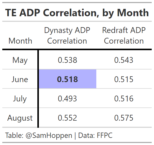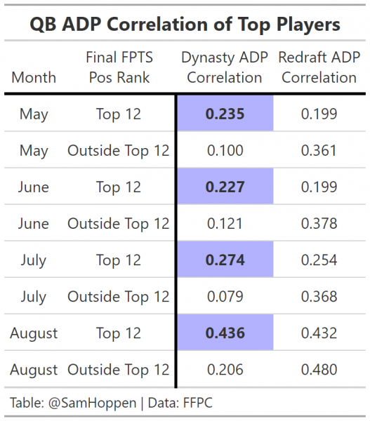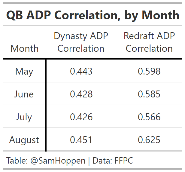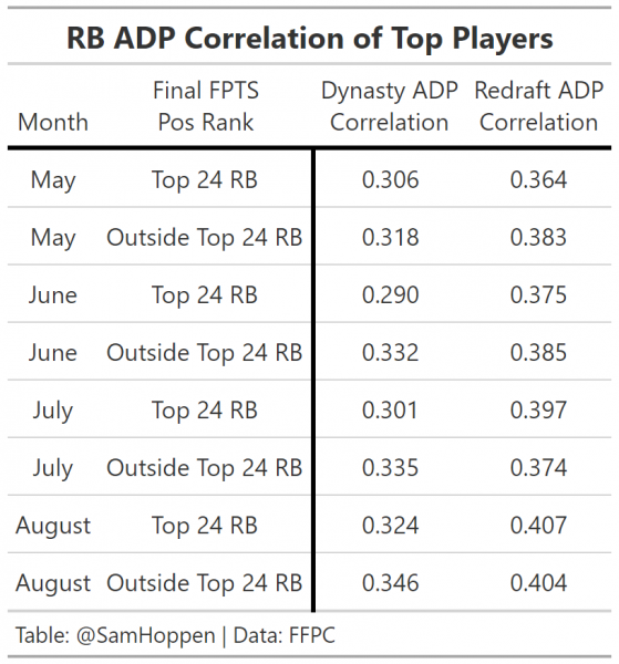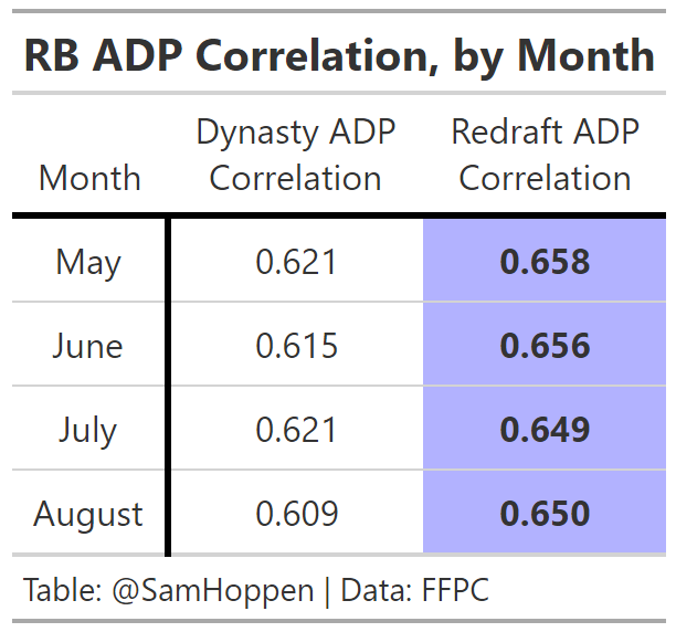 In the following tables, I have broken down each position's correlation stats based on the month of the ADP because draft szn is more than just a month long. This can help give us a better comprehension of two things. First, we can understand when in the draft cycle ADP is most efficient and best at predicting future outcomes. Second, we can identify specific points in the year when dynasty ADP may be more useful than redraft ADP.