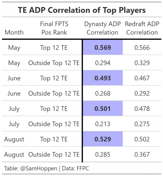 Additionally, for this study, I used ADP and scoring data from FFPC dynasty and redraft best ball leagues. I used FFPC average draft position for two reasons. First, it offers ADP for both redraft and dynasty. I wanted to ensure that the source of the ADP came from the same place. Second, FFPC drafters are largely seen as sharp drafters due to the high-stakes nature of each league. The FFPC notably uses tight end-premium scoring (1.5 points per reception for tight ends), but my analysis takes this into consideration.