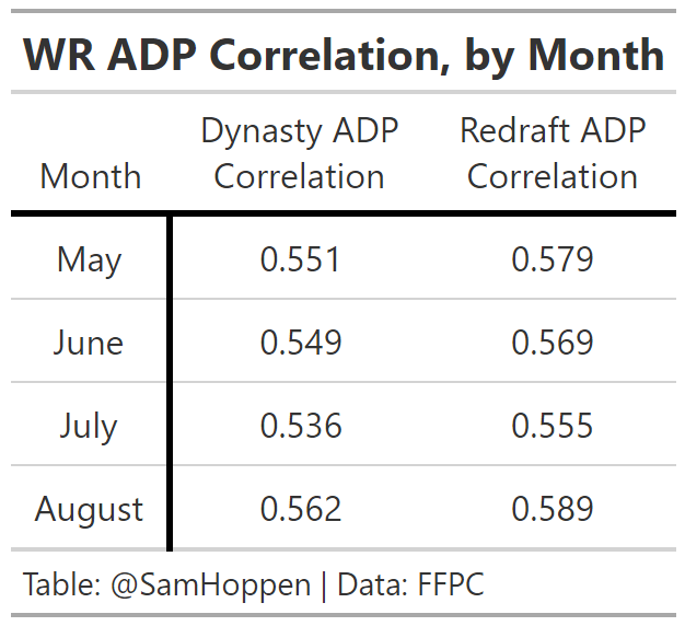 With wide receivers, the trends are quite similar and align with what we've seen already. It's small, but redraft still has a slight edge over dynasty ADP.
