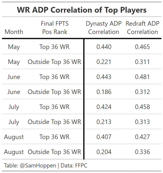 There aren't many surprises when it comes to the running back position. But, as I have highlighted, the redraft correlation in June and August for running backs is extremely high. In fact, among all of the numbers that I will show you in this article, they are among the two highest. My big takeaway with this is that the market does a really good job in pricing running back value. This would also suggest that the Zero-RB approach may not be as beneficial.