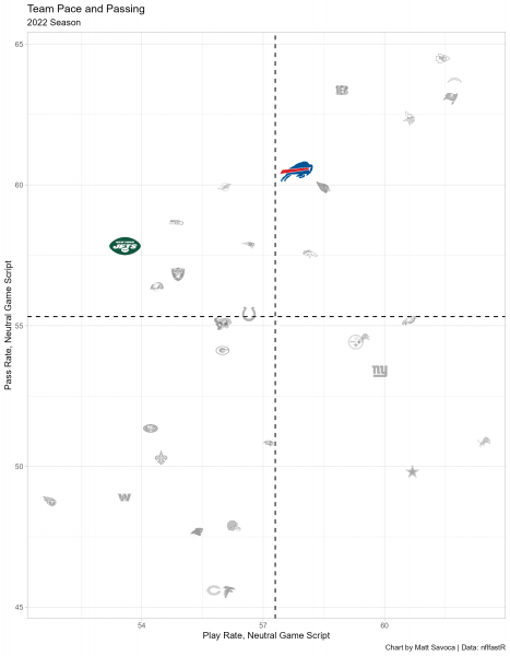 The Jets’ place on this chart cannot be trusted whatsoever. When you have a quarterback upgrade as significant as they’ve had this offseason, we should simply assume this squad in the dead center of the chart above until we have more information. It should be noted that the Rodgers-led Packers actually found themselves in the lower-left quadrant of the graph, indicating they were below average in both pace of play and pass rate in neutral game scripts. This author’s hunch is that the Jets aren’t nearly as interested as being a run-oriented offense as Green Bay was in 2022 (and appears to be again in 2023).