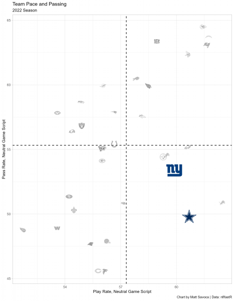 Both the Giants and Cowboys are uptempo offenses. Neither, however, is traditionally pass-first, though you could make very legitimate arguments that both teams have reasons to commit more to the pass this year than in seasons past. The Cowboys no longer have Ezekiel Elliott, who commandeered a large portion of the weekly touches, and no longer have a lacking wide receiver corps behind CeeDee Lamb. The trio of Lamb, Brandin Cooks, and (a significantly healthier version) Michael Gallup can be among the league’s best, and running back Tony Pollard’s pass-catching prowess only adds to the myriad ways this offense can attack opposing defenses.