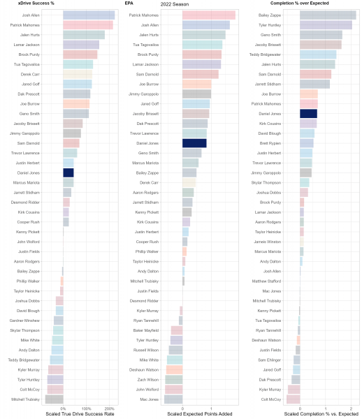 Both quarterbacks found themselves in the “solidly above-average” category in the three key efficiency indicators above. Jones, who had been inconsistent as a passer in his first few years as a starter, came into his own in 2022, ranking in line with superstars Patrick Mahomes and Joe Burrow in terms of completion percentage vs. expectation. While he still has room to improve on a per-play and per-drive level, all indications are that Jones is capable of leading a highly competent offense. His threat as a rusher makes him difficult to scheme for, and his added weaponry at the skill positions thrives in the same areas Jones does (short-to-mid area and inside-the-numbers). All in all, the Giants' front office and coaching staff have given Jones and this offense every chance to succeed, now it’s up to him to execute.