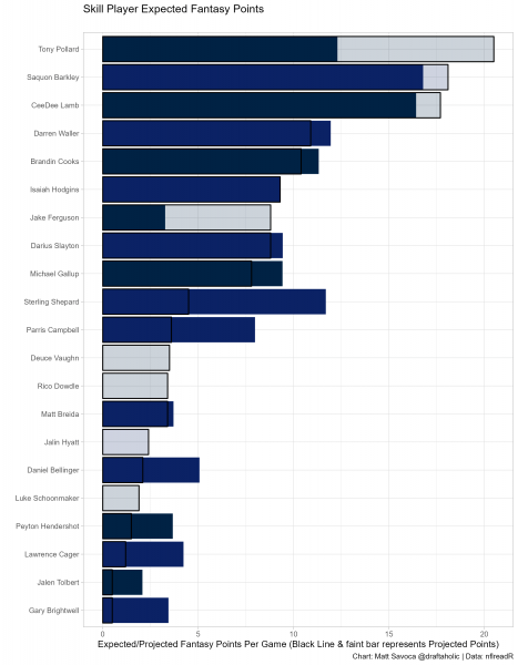 In this chart, we’ll observe a player’s opportunity value, measured in Expected Fantasy Points per Game and represented by the solid-color bars. We can then compare that to the 4for4 projections, represented by the faint-color bars. When the faint bar is not visible, it indicates the player’s previous opportunity value is greater than their projected value.