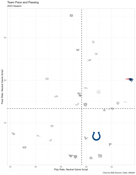 This chart represents the general offensive strategies for each team when the game outcome is still in question (win probability between 20% and 80%). The final two minutes of each half are also excluded. We’ll include last year’s statistics through Week 4 of the regular season. Teams in the upper-right quadrant pass more often and play faster than the average NFL team in neutral game scripts, and conversely, teams in the lower-left quadrant play slower and run more often than the average NFL team.