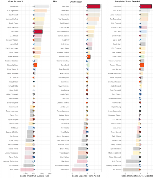 While there may be 22 people on the field for every play, each play and game is heavily dictated by the performance of each team’s quarterback. While efficiency isn’t everything for quarterbacks, it is the best indicator of future performance, so we use a trio of metrics to suss out top performers at the position compared to lackluster ones. xDrive Success %, or True Drive Success Rate, is a measurement of a QB’s ability to turn drives into scores weighted by sample size. EPA or Expected Points Added, is a measurement of the QB’s contribution, both running and throwing, to the team’s scoring and production vs. the average NFL team. Completion % over Expected (CPOE)represents the accuracy and efficiency of a QB’s passes compared to league expectations.