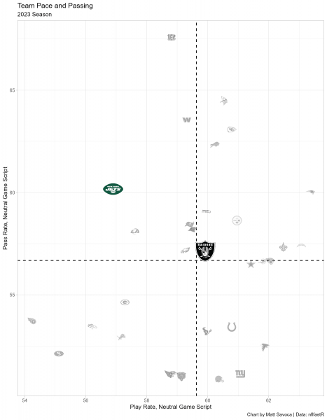 This chart represents the general offensive strategies for each team when the game outcome is still in question (win probability between 20% and 80%). The final two minutes of each half are also excluded. We’ll include last year’s statistics through Week 4 of the regular season. Teams in the upper-right quadrant pass more often and play faster than the average NFL team in neutral game scripts, and conversely, teams in the lower-left quadrant play slower and run more often than the average NFL team.