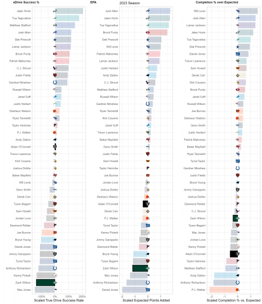 While there may be 22 people on the field for every play, each play and game is heavily dictated by the performance of each team’s quarterback. While efficiency isn’t everything for quarterbacks, it is the best indicator of future performance, so we use a trio of metrics to suss out top performers at the position compared to lackluster ones. xDrive Success %, or True Drive Success Rate, is a measurement of a QB’s ability to turn drives into scores weighted by sample size. EPA or Expected Points Added, is a measurement of the QB’s contribution, both running and throwing, to the team’s scoring and production vs. the average NFL team. Completion % over Expected (CPOE)represents the accuracy and efficiency of a QB’s passes compared to league expectations.