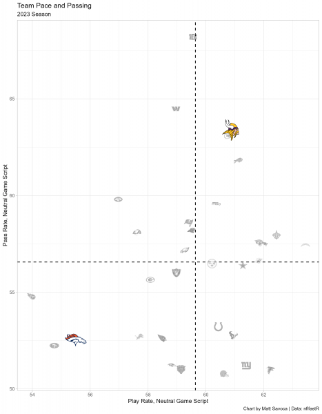This chart represents the general offensive strategies for each team when the game outcome is still in question (win probability between 20% and 80%). The final two minutes of each half are also excluded. We’ll include last year’s statistics through Week 4 of the regular season. Teams in the upper-right quadrant pass more often and play faster than the average NFL team in neutral game scripts, and conversely, teams in the lower-left quadrant play slower and run more often than the average NFL team.