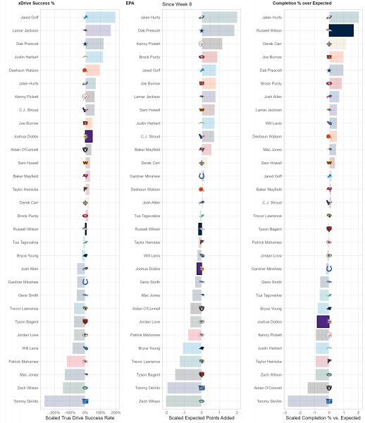 While there may be 22 people on the field for every play, each play and game is heavily dictated by the performance of each team’s quarterback. While efficiency isn’t everything for quarterbacks, it is the best indicator of future performance, so we use a trio of metrics to suss out top performers at the position compared to lackluster ones. xDrive Success %, or True Drive Success Rate, is a measurement of a QB’s ability to turn drives into scores weighted by sample size. EPA or Expected Points Added, is a measurement of the QB’s contribution, both running and throwing, to the team’s scoring and production vs. the average NFL team. Completion % over Expected (CPOE) represents the accuracy and efficiency of a QB’s passes compared to league expectations.