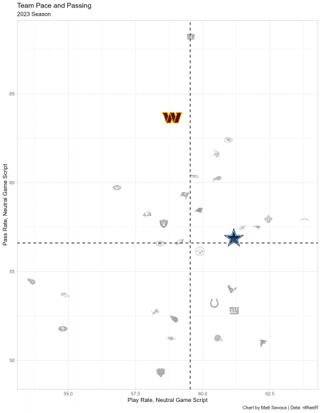 The Commanders are average in pace of play, but employ a dropback-happy approach with Sam Howell under center, especially as the team has proven that they’re perfectly content to let Howell scramble if he can’t find anything downfield. They rank well above average in pass rate during neutral game scripts, but their bottom-third average score differential indicates they don’t spend a lot of time in those neutral game scripts, and like Week 11, are playing from behind. This has led Howell to average 39.7 pass plays per game, the highest rate of any team in the NFL. Howell is neck and neck with Prescott in total passing touchdowns this season, trailing 19 to 18. He’s also needed 104 more passes to do so.