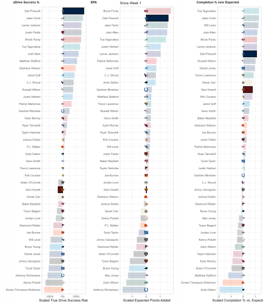 While there may be 22 people on the field for every play, each play and game is heavily dictated by the performance of each team’s quarterback. While efficiency isn’t everything for quarterbacks, it is the best indicator of future performance, so we use a trio of metrics to suss out top performers at the position compared to lackluster ones. xDrive Success %, or True Drive Success Rate, is a measurement of a QB’s ability to turn drives into scores weighted by sample size. EPA or Expected Points Added, is a measurement of the QB’s contribution, both running and throwing, to the team’s scoring and production vs. the average NFL team. Completion % over Expected (CPOE)represents the accuracy and efficiency of a QB’s passes compared to league expectations.