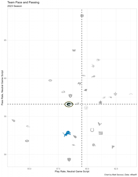 This chart represents the general offensive strategies for each team when the game outcome is still in question (win probability between 20% and 80%). The final two minutes of each half are also excluded. We’ll include last year’s statistics through Week 4 of the regular season. Teams in the upper-right quadrant pass more often and play faster than the average NFL team in neutral game scripts, and conversely, teams in the lower-left quadrant play slower and run more often than the average NFL team.