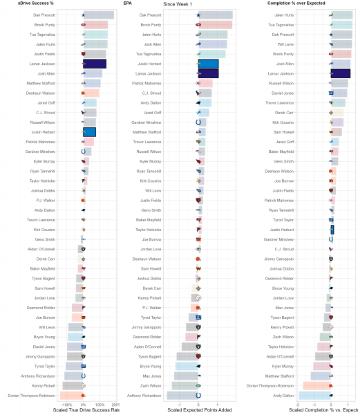 Meanwhile, Justin Herbert’s completion percentage vs expectation is league-average but is impacted by a receiving corps that ranks fifth in the NFL in drops despite a top-10 catchable pass rate. Herbert’s true drive success rate indicates a player more than capable of turning drives into scores and an above-average clip, and Herbert ranks just ahead of Jackson in EPA per game, 6th best in the NFL. He’s seventh in AYA and third in QBR, more signs of an unquestionably elite talent. Herbert, not typically known for his rushing upside, remains effective on the ground, and now ranks 13th in carries per game and in the top 10 in red zone carries per game, adding three rushing touchdowns to his top-three passing touchdown totals.