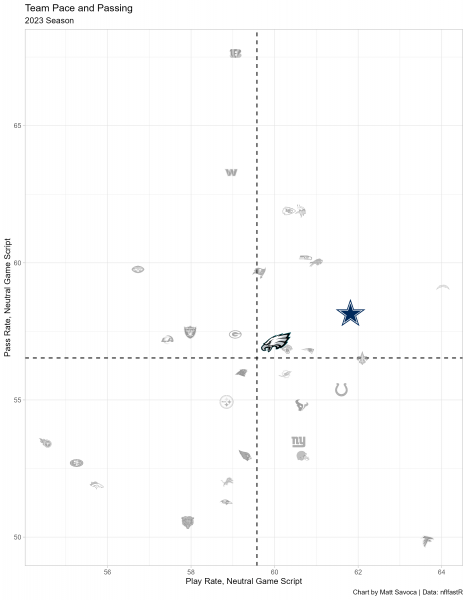 Philadelphia’s overall offensive scheme doesn’t look entirely different than Dallas’ on paper, though functionally we know that the way they structure drives is different than other teams because of the team’s otherworldly success in third- and fourth-and-short situations. Jalen Hurts still throws more, and plays faster than league average in neutral game scripts. But once again, due to a top-10 average score differential, the Eagles tamp down their aggressiveness in favor of game control. They're 21st in pass plays per game and 25th in pace of play, but still average the same number of deep passes per game as the high-flying Dallas passing attack. One area where they’re functionally very different is inside the 20, where the Eagles pass about half as much as the Cowboys, ranking 20th in red zone pass attempts per game.