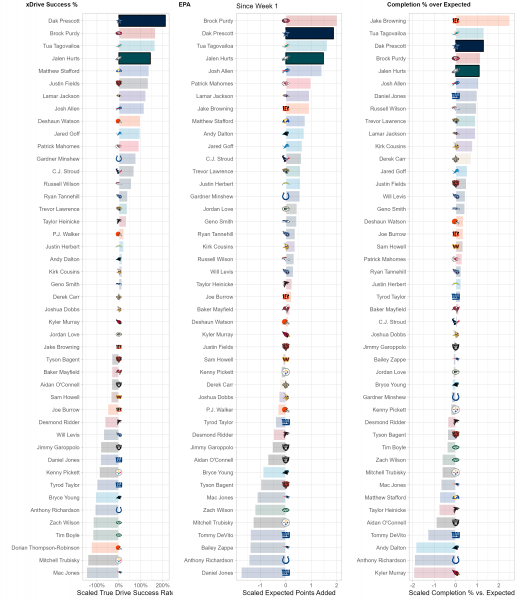 While there may be 22 people on the field for every play, each play and game is heavily dictated by the performance of each team’s quarterback. While efficiency isn’t everything for quarterbacks, it is the best indicator of future performance, so we use a trio of metrics to suss out top performers at the position compared to lackluster ones. xDrive Success %, or True Drive Success Rate, is a measurement of a QB’s ability to turn drives into scores weighted by sample size. EPA or Expected Points Added, is a measurement of the QB’s contribution, both running and throwing, to the team’s scoring and production vs. the average NFL team. Completion % over Expected (CPOE)represents the accuracy and efficiency of a QB’s passes compared to league expectations.