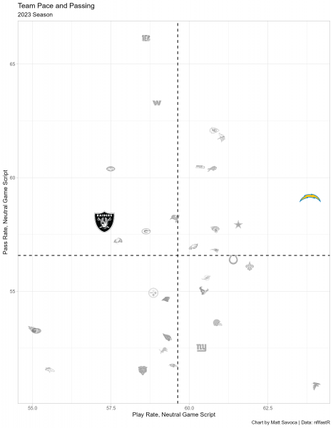 This chart represents the general offensive strategies for each team when the game outcome is still in question (win probability between 20% and 80%). The final two minutes of each half are also excluded. We’ll include last year’s statistics through Week 4 of the regular season. Teams in the upper-right quadrant pass more often and play faster than the average NFL team in neutral game scripts, and conversely, teams in the lower-left quadrant play slower and run more often than the average NFL team.