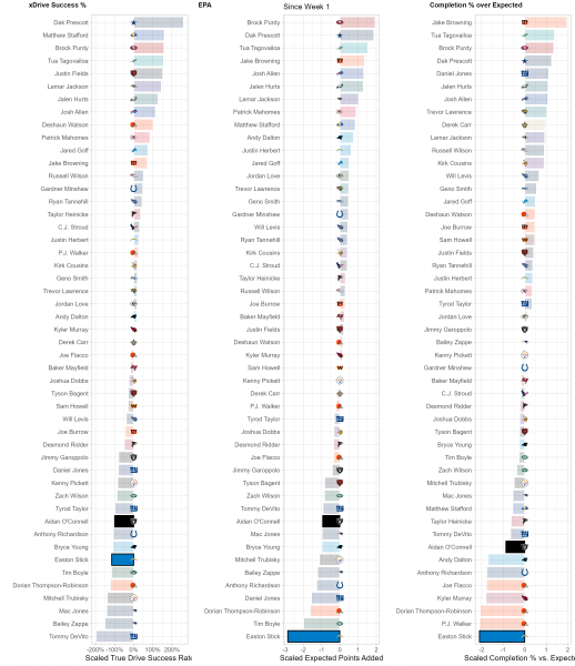 While there may be 22 people on the field for every play, each play and game is heavily dictated by the performance of each team’s quarterback. While efficiency isn’t everything for quarterbacks, it is the best indicator of future performance, so we use a trio of metrics to suss out top performers at the position compared to lackluster ones. xDrive Success %, or True Drive Success Rate, is a measurement of a QB’s ability to turn drives into scores weighted by sample size. EPA or Expected Points Added, is a measurement of the QB’s contribution, both running and throwing, to the team’s scoring and production vs. the average NFL team. Completion % over Expected (CPOE)represents the accuracy and efficiency of a QB’s passes compared to league expectations.