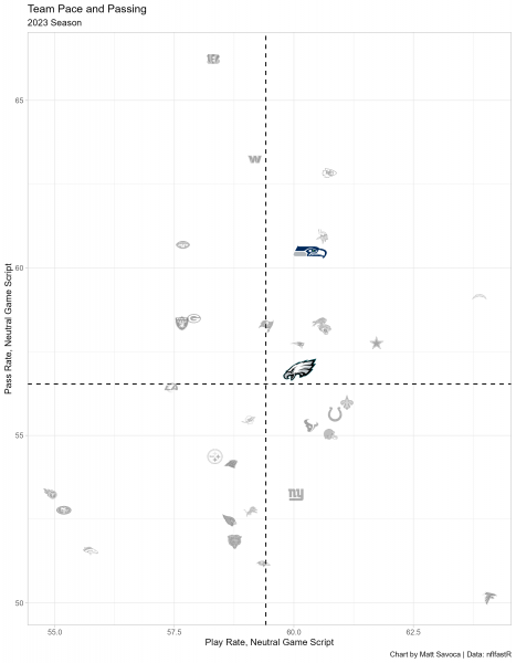 This chart represents the general offensive strategies for each team when the game outcome is still in question (win probability between 20% and 80%). The final two minutes of each half are also excluded. We’ll include last year’s statistics through Week 4 of the regular season. Teams in the upper-right quadrant pass more often and play faster than the average NFL team in neutral game scripts, and conversely, teams in the lower-left quadrant play slower and run more often than the average NFL team.