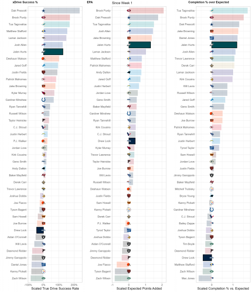 While there may be 22 people on the field for every play, each play and game is heavily dictated by the performance of each team’s quarterback. While efficiency isn’t everything for quarterbacks, it is the best indicator of future performance, so we use a trio of metrics to suss out top performers at the position compared to lackluster ones. xDrive Success %, or True Drive Success Rate, is a measurement of a QB’s ability to turn drives into scores weighted by sample size. EPA or Expected Points Added, is a measurement of the QB’s contribution, both running and throwing, to the team’s scoring and production vs. the average NFL team. Completion % over Expected (CPOE)represents the accuracy and efficiency of a QB’s passes compared to league expectations.