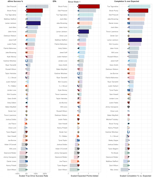 While there may be 22 people on the field for every play, each play and game is heavily dictated by the performance of each team’s quarterback. While efficiency isn’t everything for quarterbacks, it is the best indicator of future performance, so we use a trio of metrics to suss out top performers at the position compared to lackluster ones. xDrive Success %, or True Drive Success Rate, is a measurement of a QB’s ability to turn drives into scores weighted by sample size. EPA or Expected Points Added, is a measurement of the QB’s contribution, both running and throwing, to the team’s scoring and production vs. the average NFL team. Completion % over Expected (CPOE)represents the accuracy and efficiency of a QB’s passes compared to league expectations.