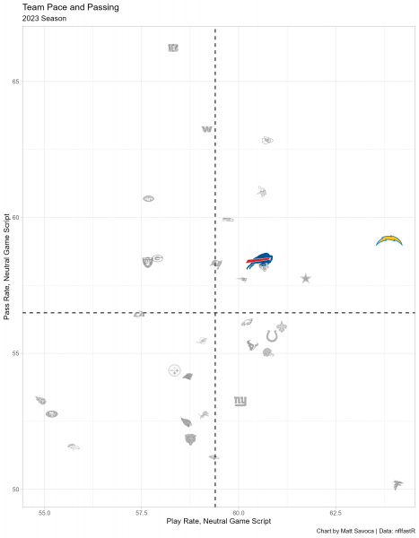 This chart represents the general offensive strategies for each team when the game outcome is still in question (win probability between 20% and 80%). The final two minutes of each half are also excluded. We’ll include last year’s statistics through Week 4 of the regular season. Teams in the upper-right quadrant pass more often and play faster than the average NFL team in neutral game scripts, and conversely, teams in the lower-left quadrant play slower and run more often than the average NFL team.