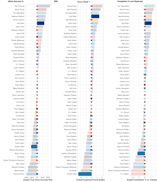 While there may be 22 people on the field for every play, each play and game is heavily dictated by the performance of each team’s quarterback. While efficiency isn’t everything for quarterbacks, it is the best indicator of future performance, so we use a trio of metrics to suss out top performers at the position compared to lackluster ones. xDrive Success %, or True Drive Success Rate, is a measurement of a QB’s ability to turn drives into scores weighted by sample size. EPA or Expected Points Added, is a measurement of the QB’s contribution, both running and throwing, to the team’s scoring and production vs. the average NFL team. Completion % over Expected (CPOE)represents the accuracy and efficiency of a QB’s passes compared to league expectations.
