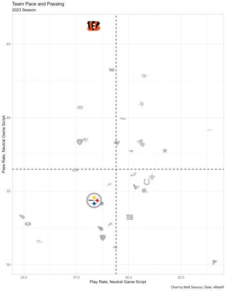 This chart represents the general offensive strategies for each team when the game outcome is still in question (win probability between 20% and 80%). The final two minutes of each half are also excluded. We’ll include last year’s statistics through Week 4 of the regular season. Teams in the upper-right quadrant pass more often and play faster than the average NFL team in neutral game scripts, and conversely, teams in the lower-left quadrant play slower and run more often than the average NFL team.