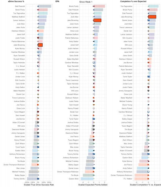 While there may be 22 people on the field for every play, each play and game is heavily dictated by the performance of each team’s quarterback. While efficiency isn’t everything for quarterbacks, it is the best indicator of future performance, so we use a trio of metrics to suss out top performers at the position compared to lackluster ones. xDrive Success %, or True Drive Success Rate, is a measurement of a QB’s ability to turn drives into scores weighted by sample size. EPA or Expected Points Added, is a measurement of the QB’s contribution, both running and throwing, to the team’s scoring and production vs. the average NFL team. Completion % over Expected (CPOE)represents the accuracy and efficiency of a QB’s passes compared to league expectations.