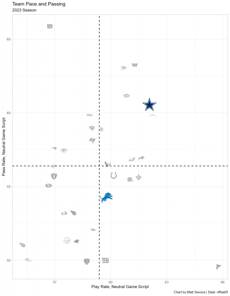 Detroit's overall pace of play ranks 22nd despite a top-10 average score differential. Contrasting what many believe, Goff and company are a pass-heavy offense in the red zone, averaging 4.9 attempts inside the 20. They’re just extremely run-heavy inside the 10, however, creating pathways for huge fantasy scores from either of their primary running backs.