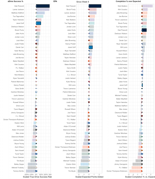 Dak Prescott is charting an MVP-level season, especially evident since Week 6. Since that point, he's leading the NFL in true drive success rate and EPA (Expected Points Added) per game. Despite dealing with the sixth most dropped passes among quarterbacks, he’s still in the top 10 in completion percentage versus expectation. Prescott adds 3-4 carries per game and has added three rushing touchdowns with his legs, clearly more comfortable scrambling than in years past.